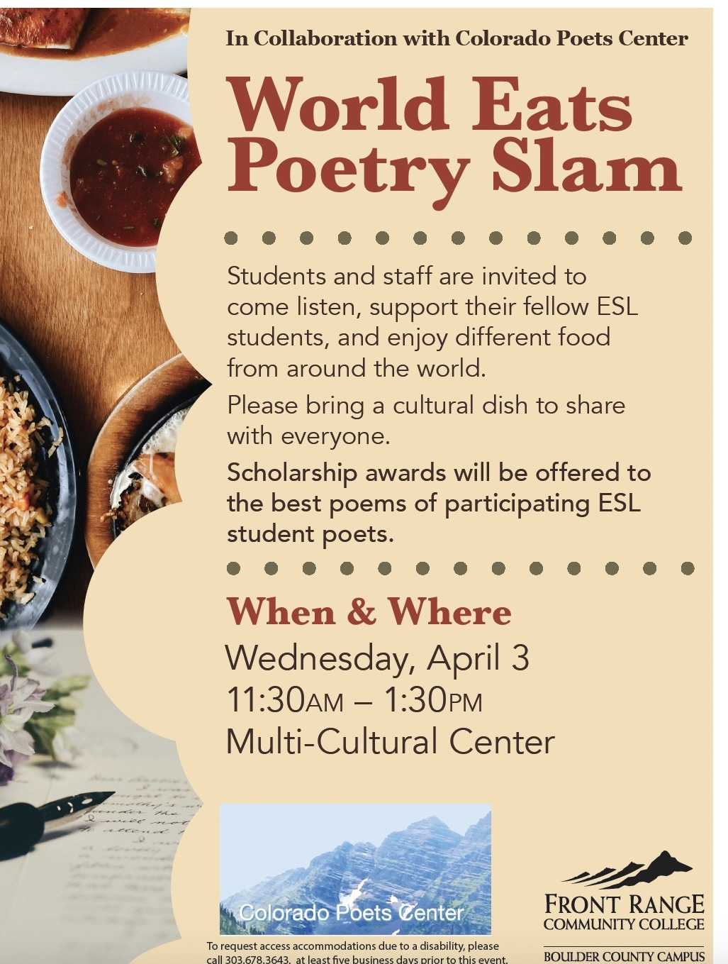 - World Eats Poetry Slam at Front Range Community College @Boulder County Community College in Longmont